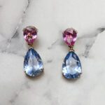 ARETES DE PLATA 925 CON BAÑO DE ORO AMARILLO, DISEÑO DE GOTAS DE CIRCONES ROSADO Y CELESTE