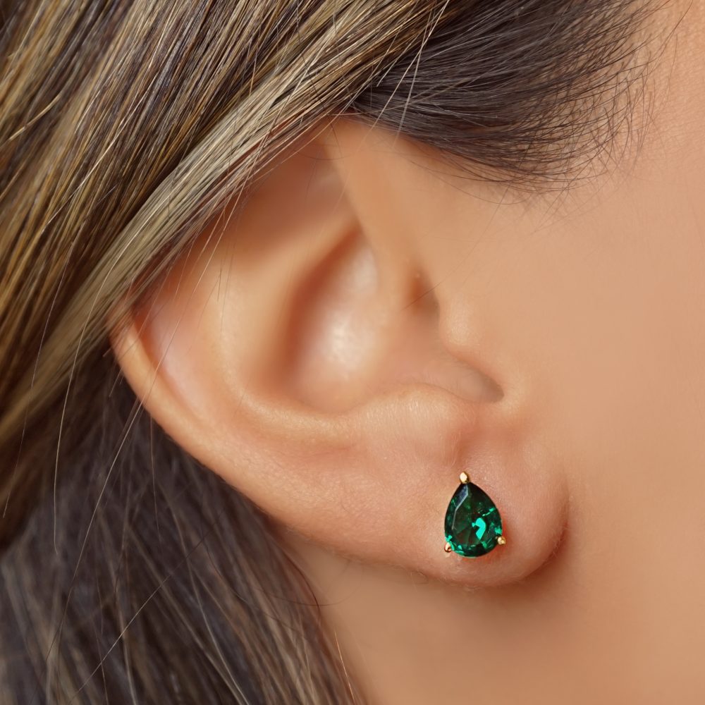 ARETES DE PLATA 925 CON BAÑO DE ORO AMARILLO, GOTA DE CIRCÓN VERDE