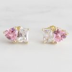 ARETES DE PLATA 925 CON BAÑO DE ORO AMARILLO, CIRCÓN DE CORAZÓN ROSA Y CIRCÓN CUADRADO BLANCO