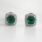 ARETES DE PLATA 925 CON BAÑO DE RODIO, CIRCÓN CUADRADO VERDE Y BORDE DE CIRCONES BLANCOS