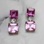 ARETES DE PLATA 925 CON BAÑO DE ORO AMARILLO, CIRCONES CUADRADOS ROSAS Y CIRCÓN, REDONDO EN EL CENTRO
