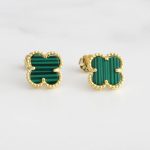 ARETES DE PLATA 925 CON BAÑO DE ORO AMARILLO, DISEÑO EN FORMA DE TRÉBOL CON RESINA COLOR MALAQUITA