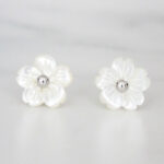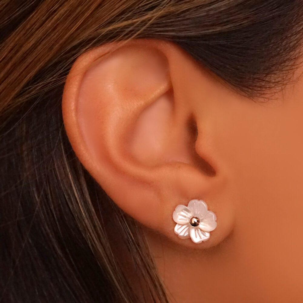 ARETES DE PLATA 925 CON BAÑO DE RODIO, FLOR CONCHA PERLA Y BOLITA DE PLATA EN EL CENTRO