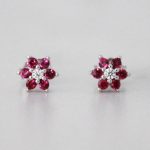 ARETES DE PLATA 925 CON BAÑO DE RODIO, DISEÑO DE FLOR Y PÉTALOS DE CIRCONES EN COLOR ROJO
