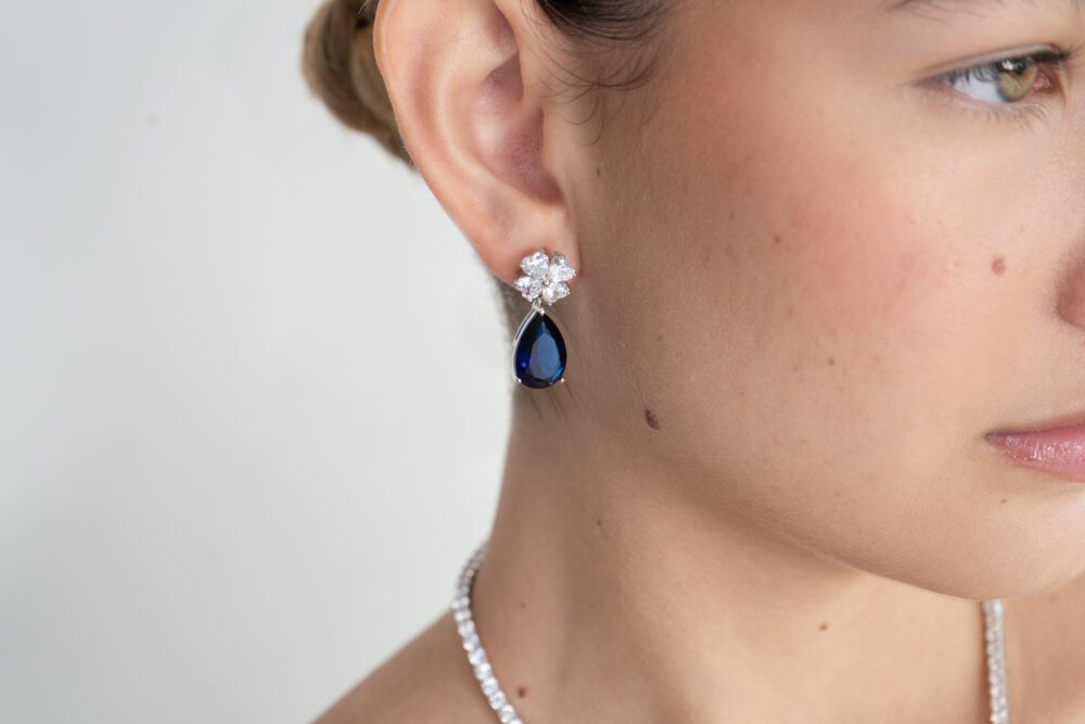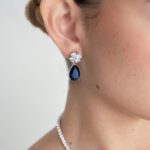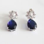 ARETES DE PLATA 925 CON BAÑO DE RODIO, FLOR CON CIRCONES Y GOTA DE CIRCÓN AZUL