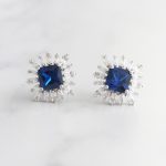 ARETES DE PLATA 925 CON BAÑO DE ORO CUADRADO CON CIRCÓN AZUL EN EL CENTRO Y BORDE DE CIRCONES BLANCOS BAGUETTES