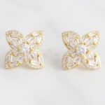 ARETES DE PLATA 925 CON BAÑO DE ORO AMARILLO, DISEÑO DE FLORES DE CUATRO PÉTALOS DE CIRCONES BAGUETTES