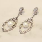ARETES DE PLATA 925 CON BAÑO DE RODIO, EN FORMA DE GOTA CON PERLA EN EL CENTRO Y BORDE DE CIRCONES