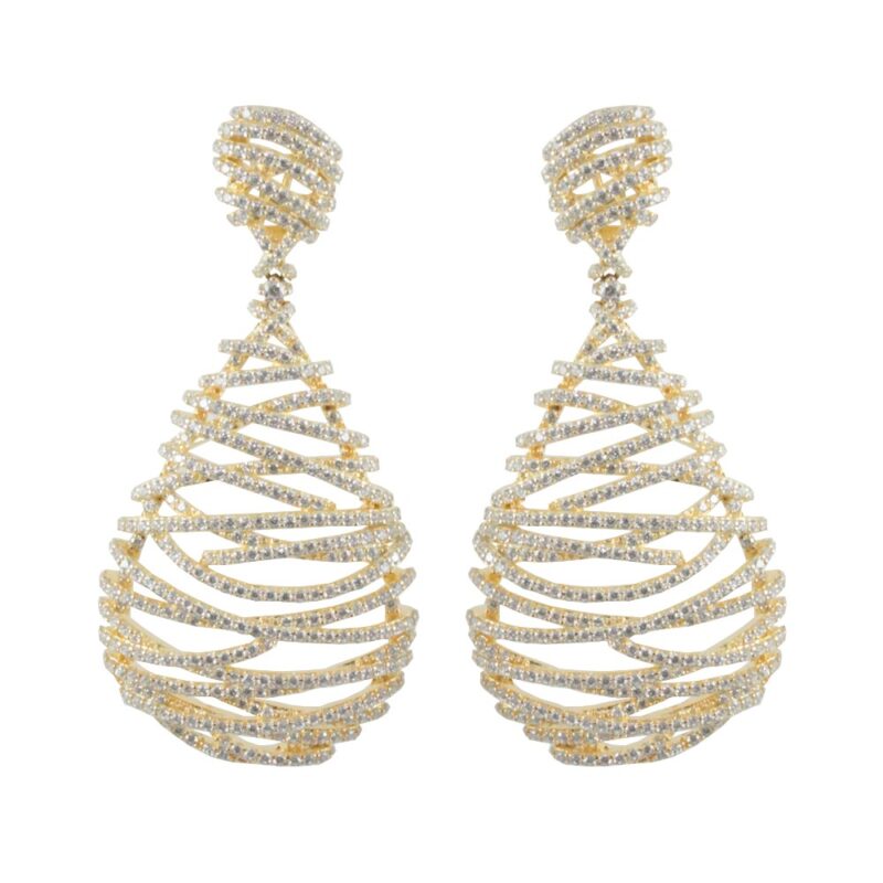 ARETES DE PLATA 925 CON BAÑO DE ORO AMARILLO, FILAS DE CIRCONES EN FORMA DE GOTA