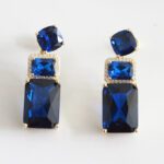 ARETES DE PLATA 925 CON BAÑO DE ORO, CON CIRCÓN AZUL REDONDO Y CIRCONES RECTANGULARES