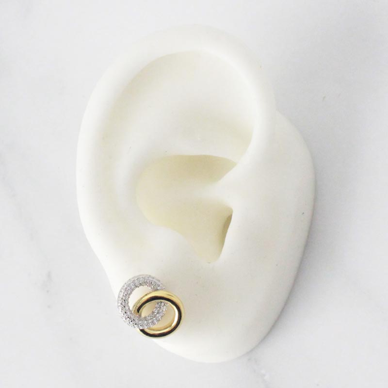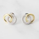 ARETES DE PLATA 925 CON BAÑO DE ORO AMARILLO Y BAÑO DE RODIO, TIPO BOTON DOS RUEDAS ENTRELAZOS UNA PAVÉ DE CIRCONES