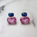ARETES DE PLATA 925 CON BAÑO DE ORO AMARILLO, CIRCONES OVALADOS ROSADO Y CIRCÓN AZUL