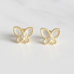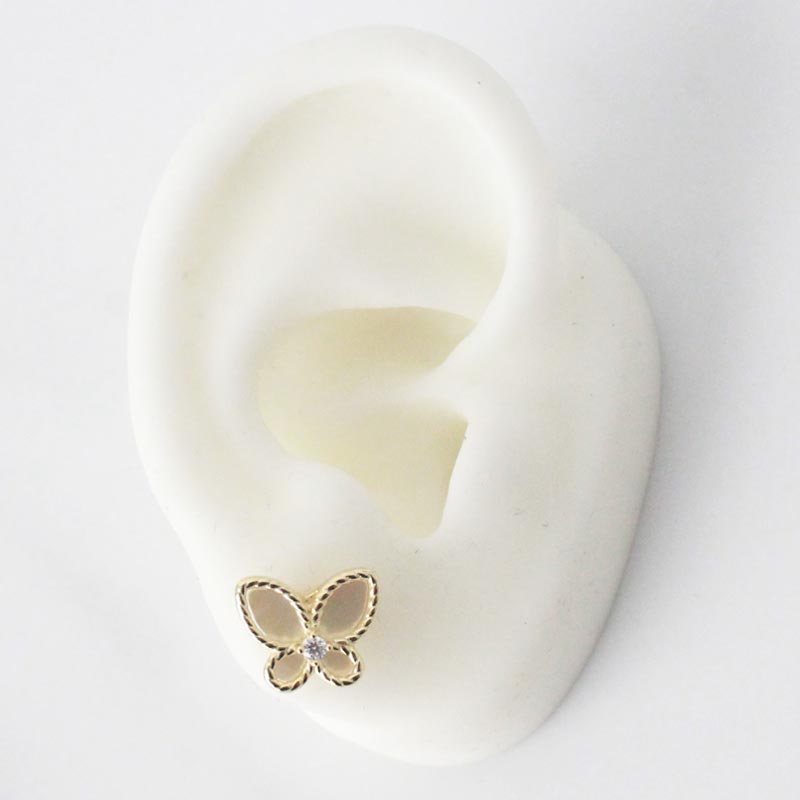 ARETES DE PLATA 925 CON BAÑO DE ORO AMARILLO, MARIPOSA CONCHA NACAR Y CIRCONES