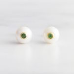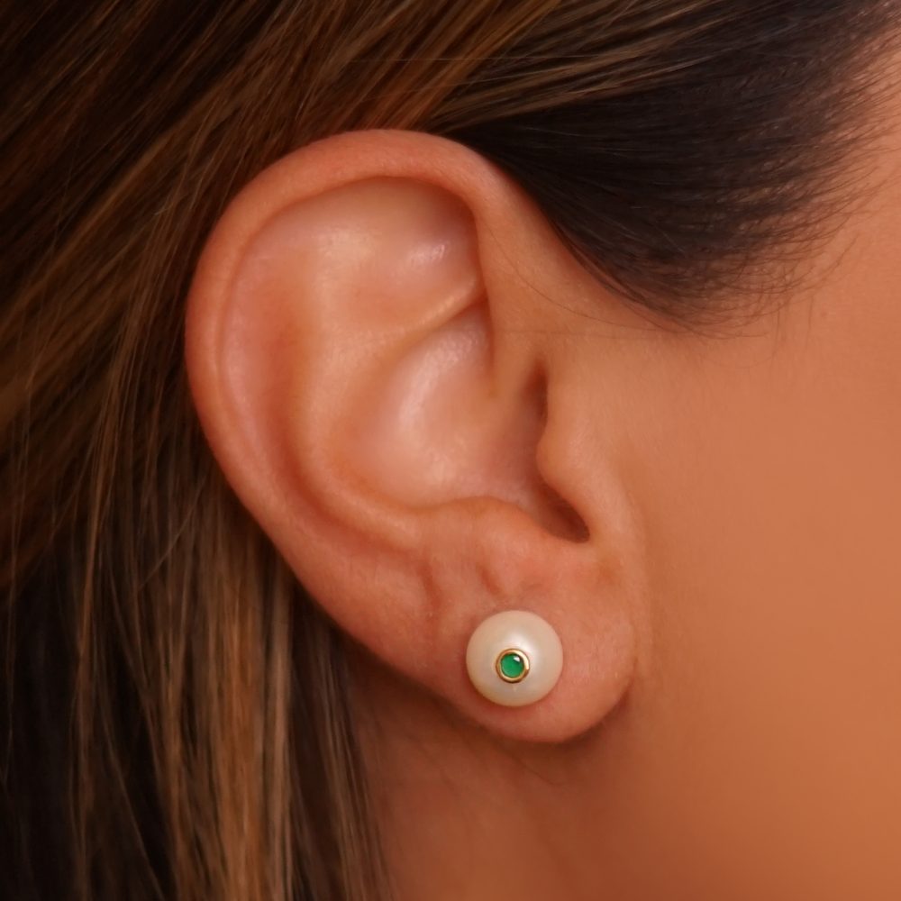 ARETES DE PLATA 925 CON BAÑO DE ORO AMARILLO Y PERLA CON CIRCÓN VERDE EN EL CENTRO