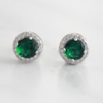 ARETES DE PLATA 925 CON BAÑO DE ORO, CIRCÓN REDONDO VERDE Y BORDE DE CIRCONES BLANCOS