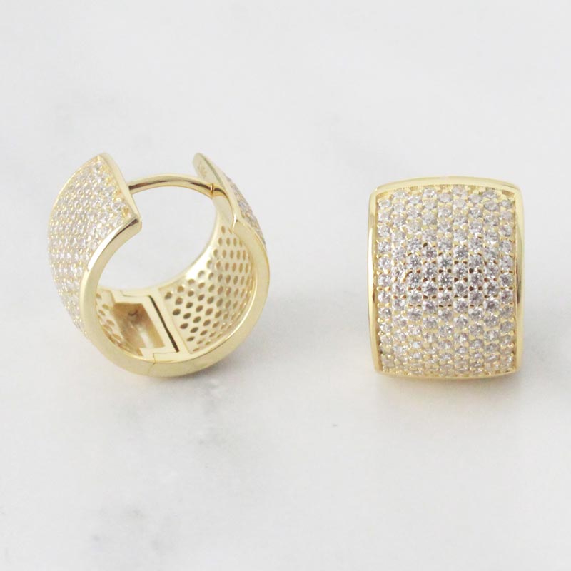 ARETES DE PLATA 925 CON BAÑO DE ORO AMARILLO, ARGOLLAS GRUESAS PAVÉ DE CIRCONES