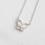 CADENA DE PLATA 925 CON BAÑO DE RODIO, DIJE DE MARIPOSA CON ALAS DE CONCHA Y PERLA, BORDE ESTORCHADO CON CIRCÓN EN MEDIO