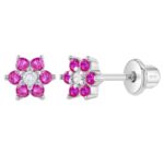 ARETE ORTOPÉDICO DE PLATA 925 CON BAÑO DE ORO CIRCONES ROJAS EN FORMA DE PÉTALOS CON CENTRO BLANCO