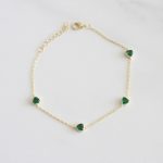 PULSERA DE PLATA 925 CON BAÑO DE ORO AMARILLO, DIJES DE CIRCONES EN FORMA DE CORAZÓN COLOR VERDE